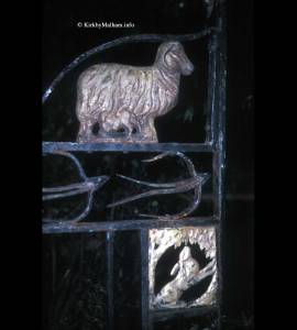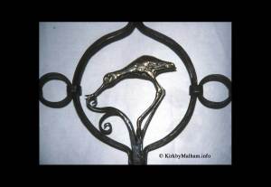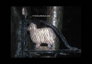 At Dale House in Malham village there is a fine pair of gates in wrought iron. They show a ewe with its lambs, a ram, a hare, and a curlew surmounted by two swans’ heads all gilded, a flight of swallows, two foxes’ heads and ears of com and the framework in black wrought iron. In The Buck Inn in Malham village a beautifully wrought copper fire hood, depicting foxes can be seen, made it is said from an old copper hot-water tank (no longer on view), and in the tiny hamlet of Hanlith, a weather vane, depicting a curlew, a hare,and a fox, surmounted by a badger (the full bodied beaten copper badger has unfortunately been replaced by a flat metal cut-out).